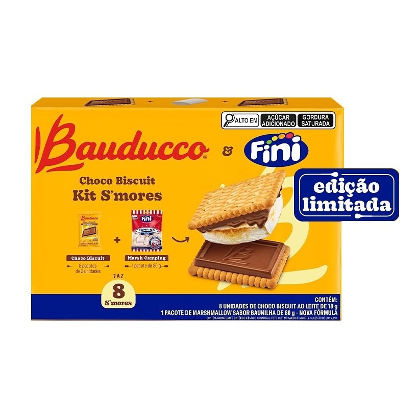 Caixa Bauducco e Fini Marshmallow Baunilha com Choco Biscuit Kit Smores 8 pacotes biscoito 1 pc Fini