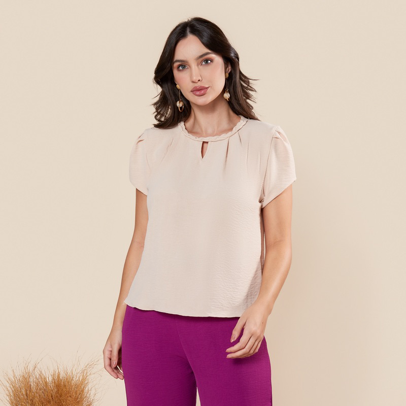 Blusa feminina lisa manga curta tecido crepe duna com detalhes na gola
