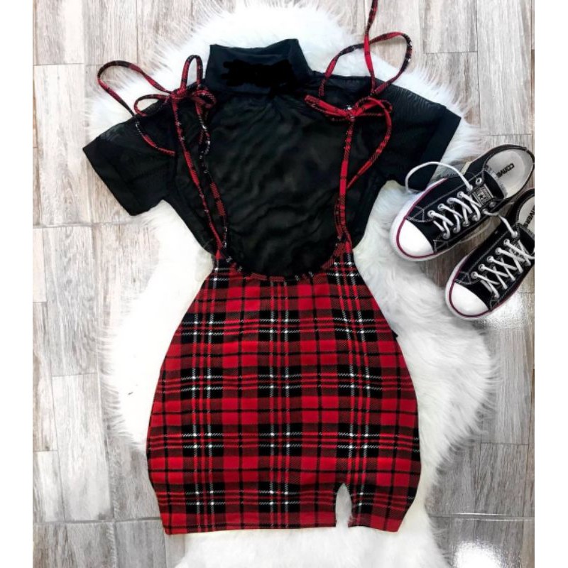 Salopete xadrez vermelha Saia xadrez Vestido xadrez