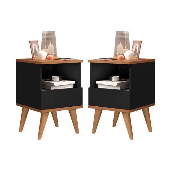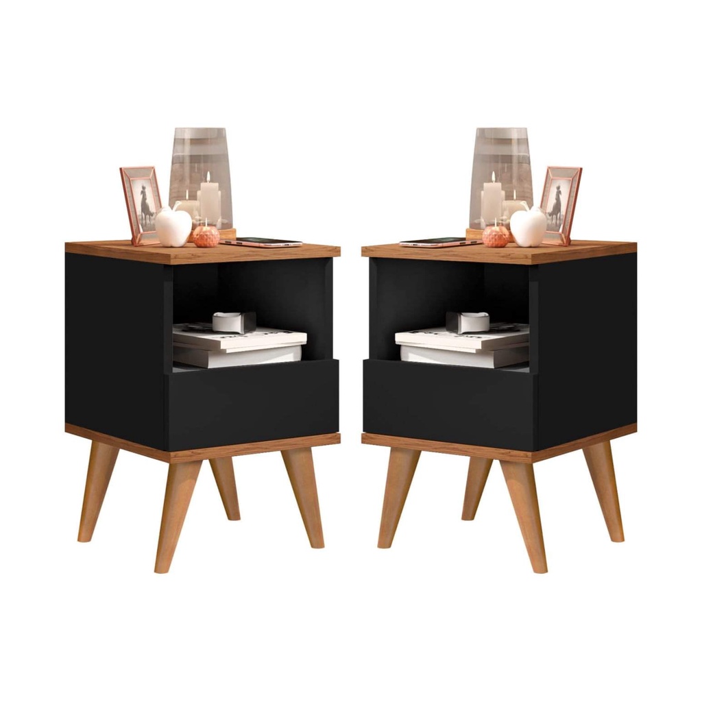 Kit Duas Mesas De Cabeceira Retrô Pés Palito Em Madeira Maciça - Bled - Preto Com Nature