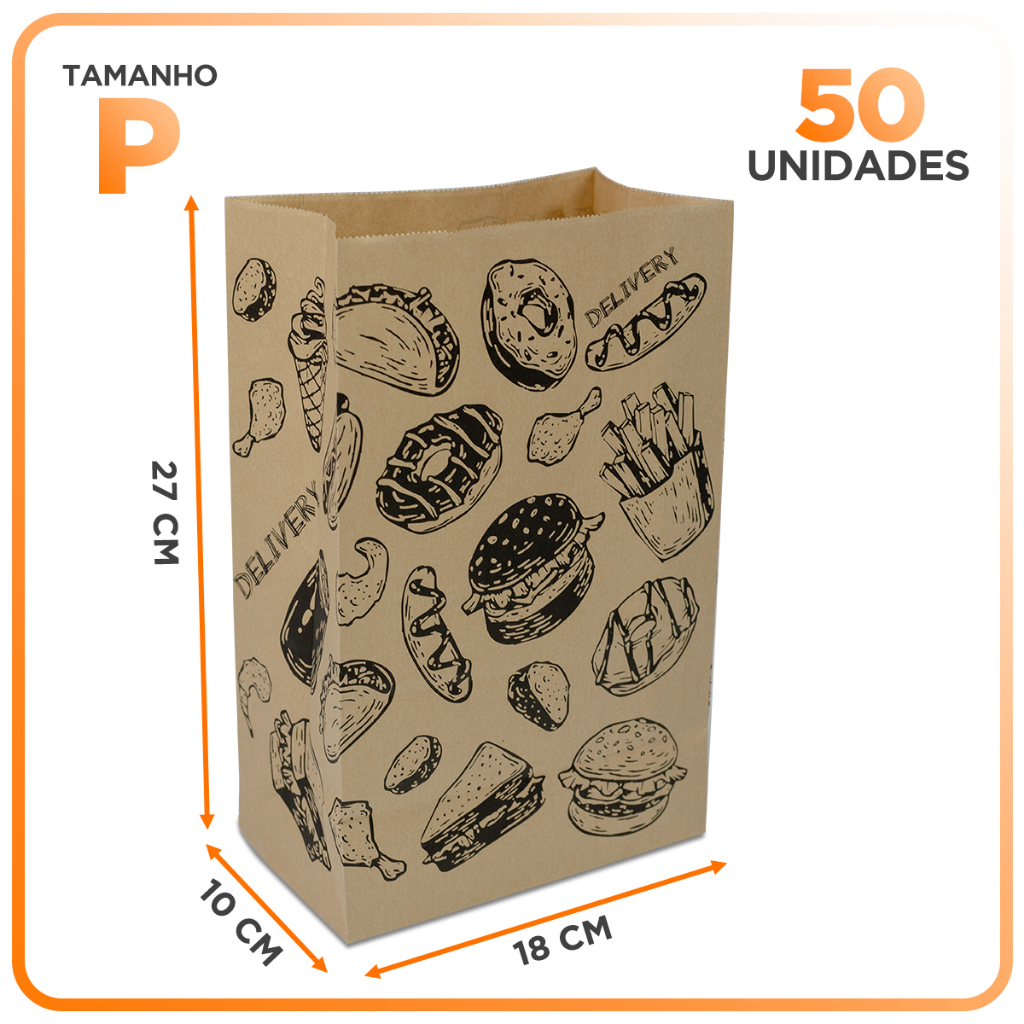50 Sacos Papel Kraft Delivery - 27 x 18 x 10 cm - Tamanho P - Embalagem Comida Entrega