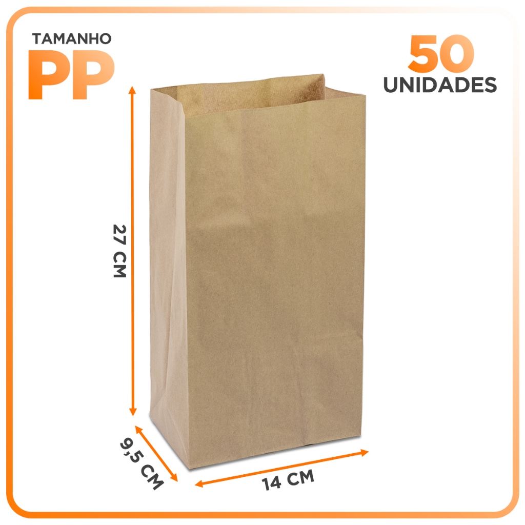 50 Sacos Papel Kraft Delivery - 27 x 14 x 9,5 cm - Tamanho PP - Embalagem Comida Entrega