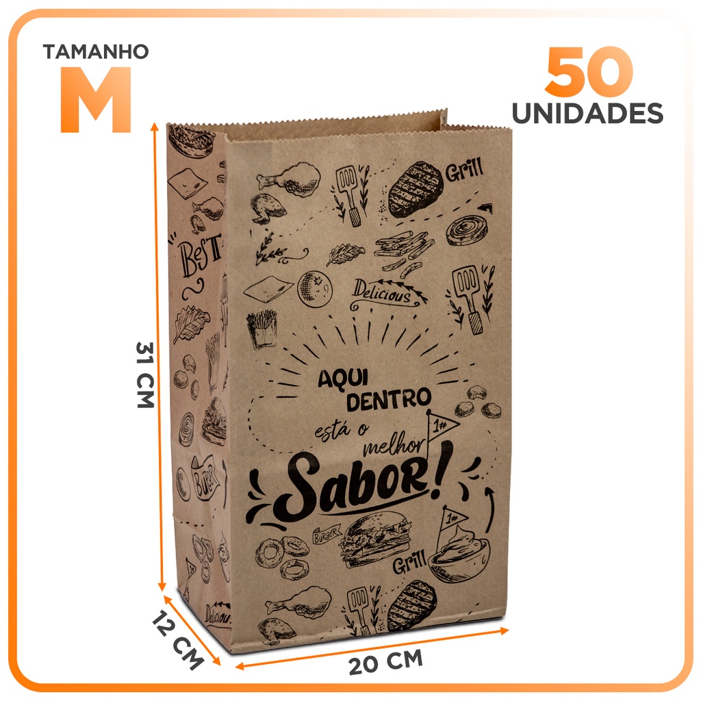 50 Sacos De Papel Kraft Natural 34 X 20 X 12 Cm Tamanho M - Melhor Sabor - Embalagem Delivery Comida Entrega