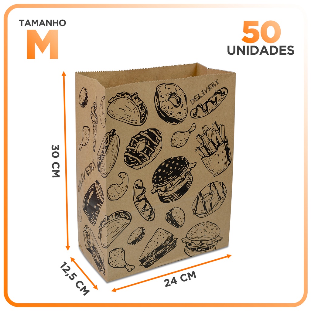 50 Sacos Papel Kraft Delivery - 30 x 24 x 12,5 cm - Tamanho M - Embalagem Comida Entrega