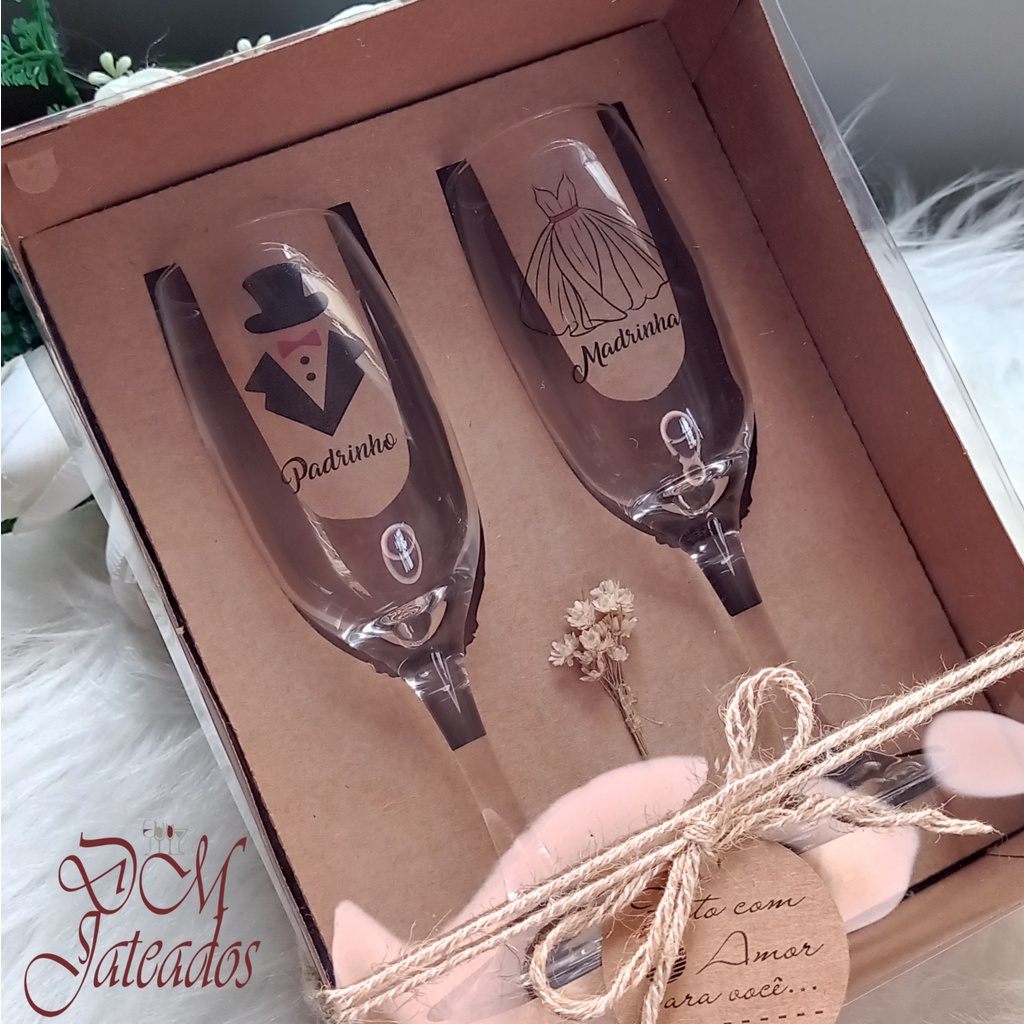 Kit Lembrança Padrinhos - Caixa + 2 Taças Terno E Vestido / Padrinho Madrinha