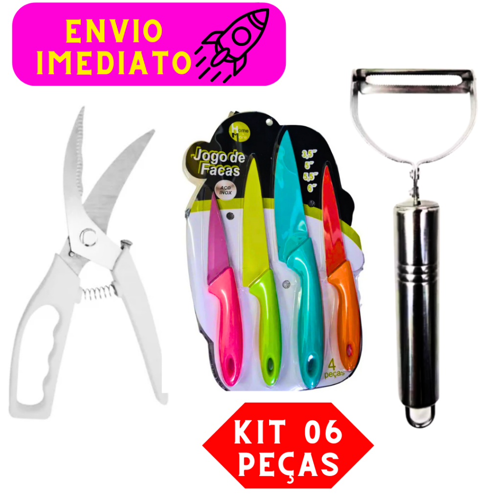Kit 06 Peças 01 Jogo de Facas Com 04 Facas 01 Descascador e 01 Tesoura de Cortar Frango Aço Inox de