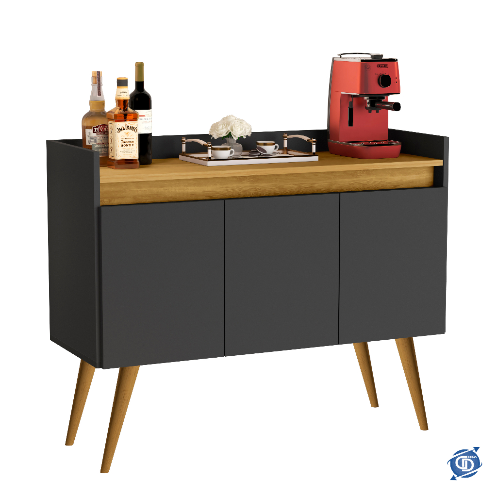 Aparador Sala Retrô Pés Palito Em Madeira Maciça - Luxo 3 Portas - Preto Com Madeirado - Lojas GD Móveis