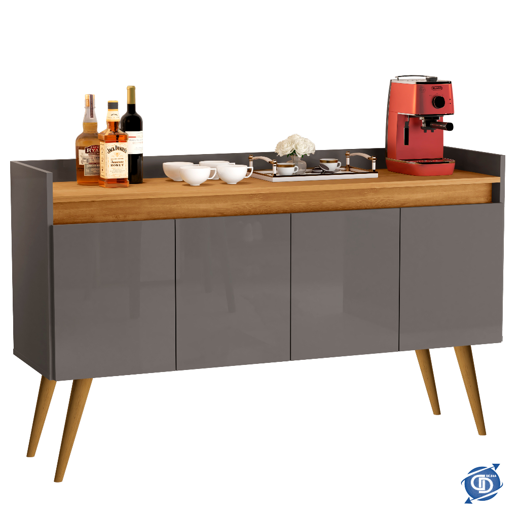 Aparador Sala Retrô Pés Palito Em Madeira Maciça - Luxo 4 Portas - Cinza Com Madeirado - Lojas GD Móveis