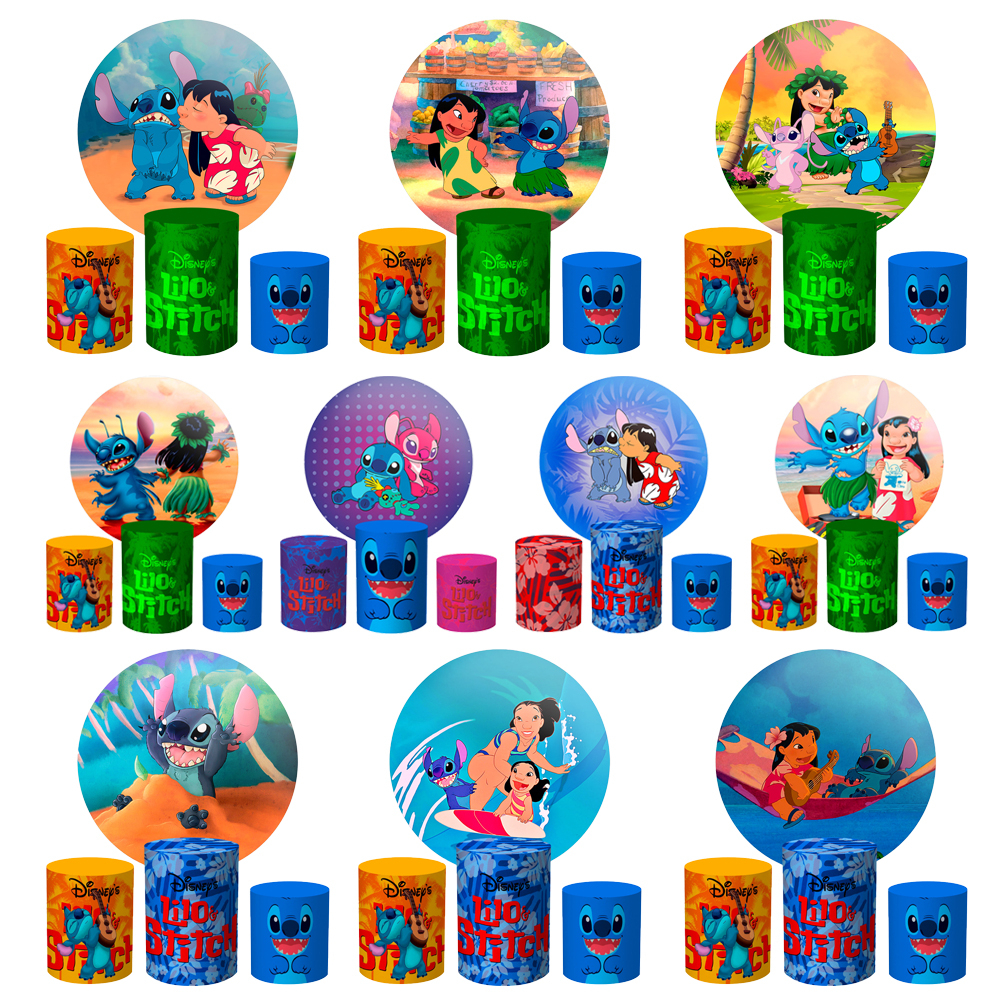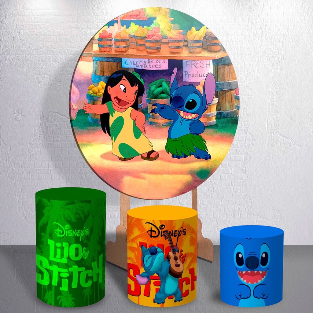 Kit Festa Infantil Capa Painel Redondo + Trio Capas de Cilindros Tema Lilo e Stitch Menino Menina