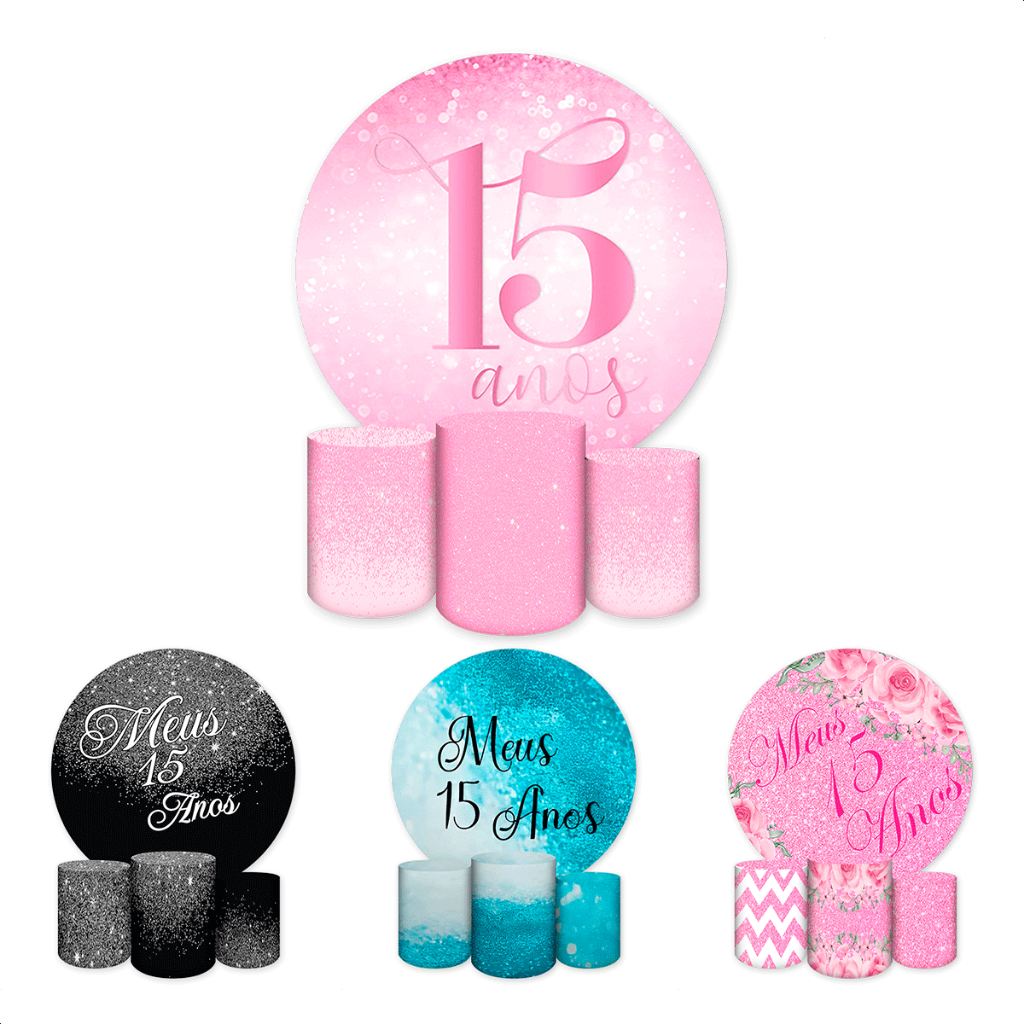 Kit Capa Painel Redondo + Trio Capas de Cilindros Sublimado Tema 15 Anos