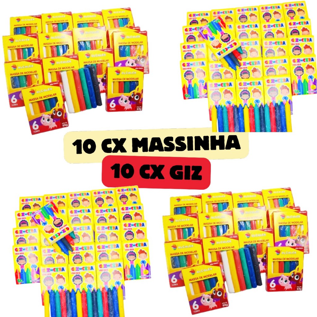 10 Cx Massinha de Modelar + 10 Cx Giz de Cera p/ Kit Festa Lembrancinha Infantil