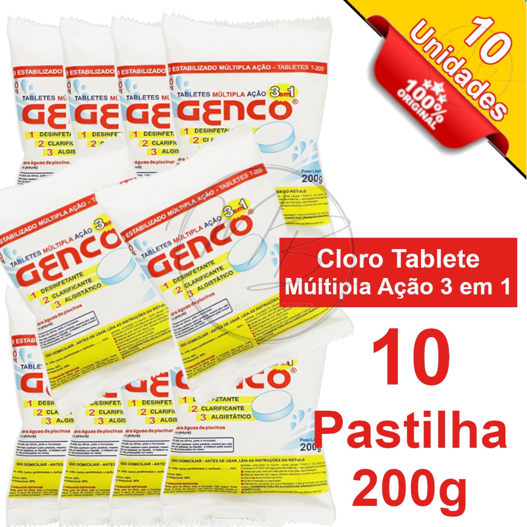 Kit 10 Tabletes Cloro para Piscina Multiação 3 em 1 200 g Pastilha - Genco