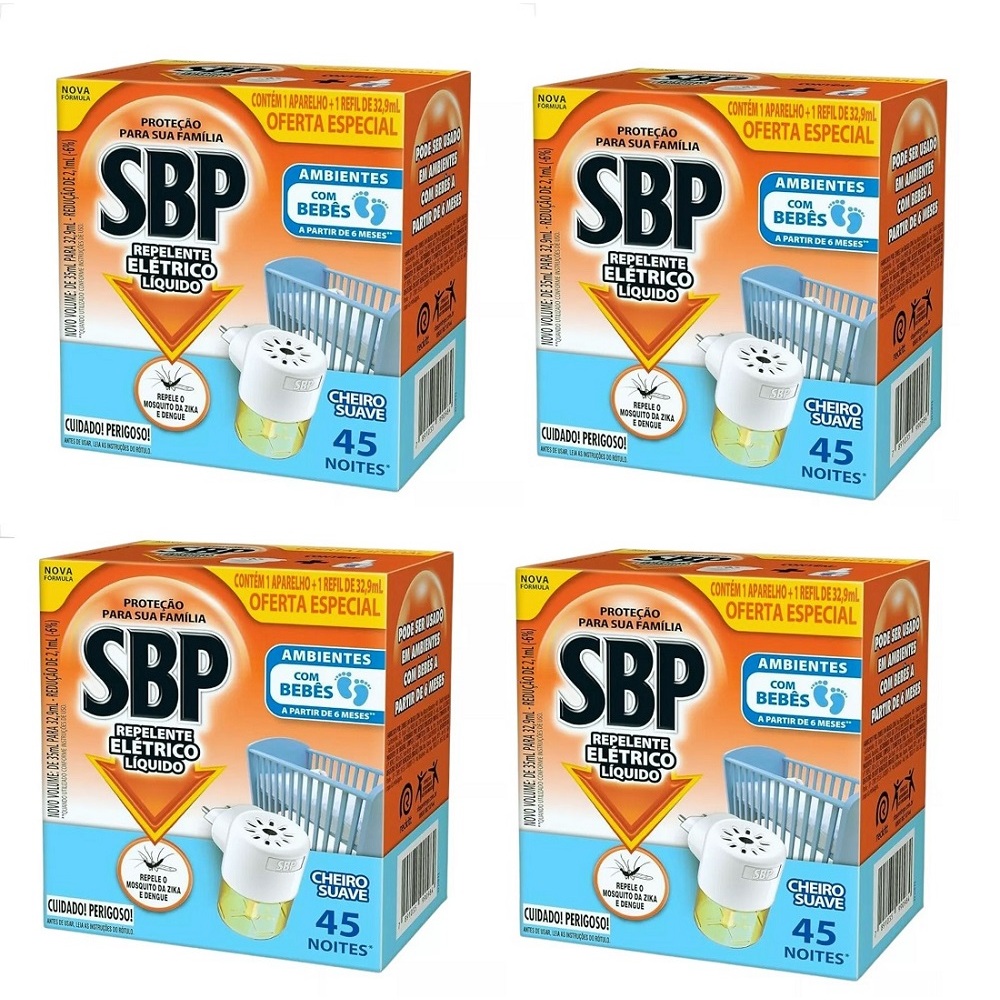 Kit 4 Aparelho Repelente SBP Elétrico + 4 Refil de 35 ml Líquido 45 Noites