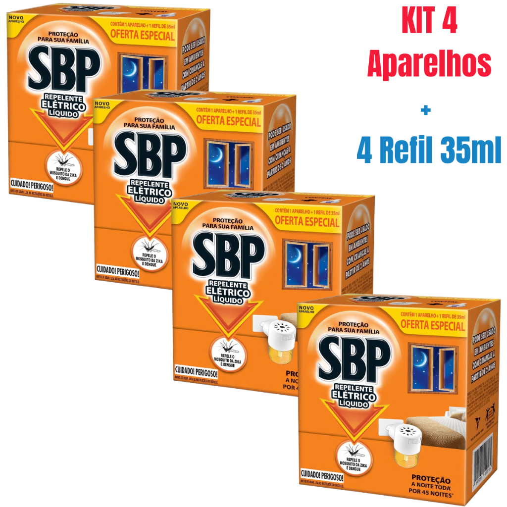 Kit 4 Aparelho Elétrico SBP + 4 Refil Repelente Líquido SBP 35ml