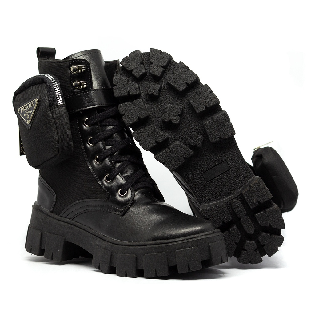 Bota Coturno unisex Estilo Prada,preta e na cor off Tratorada Com Bolsinha Lateral Removível - estilo blogueira/o removível ,