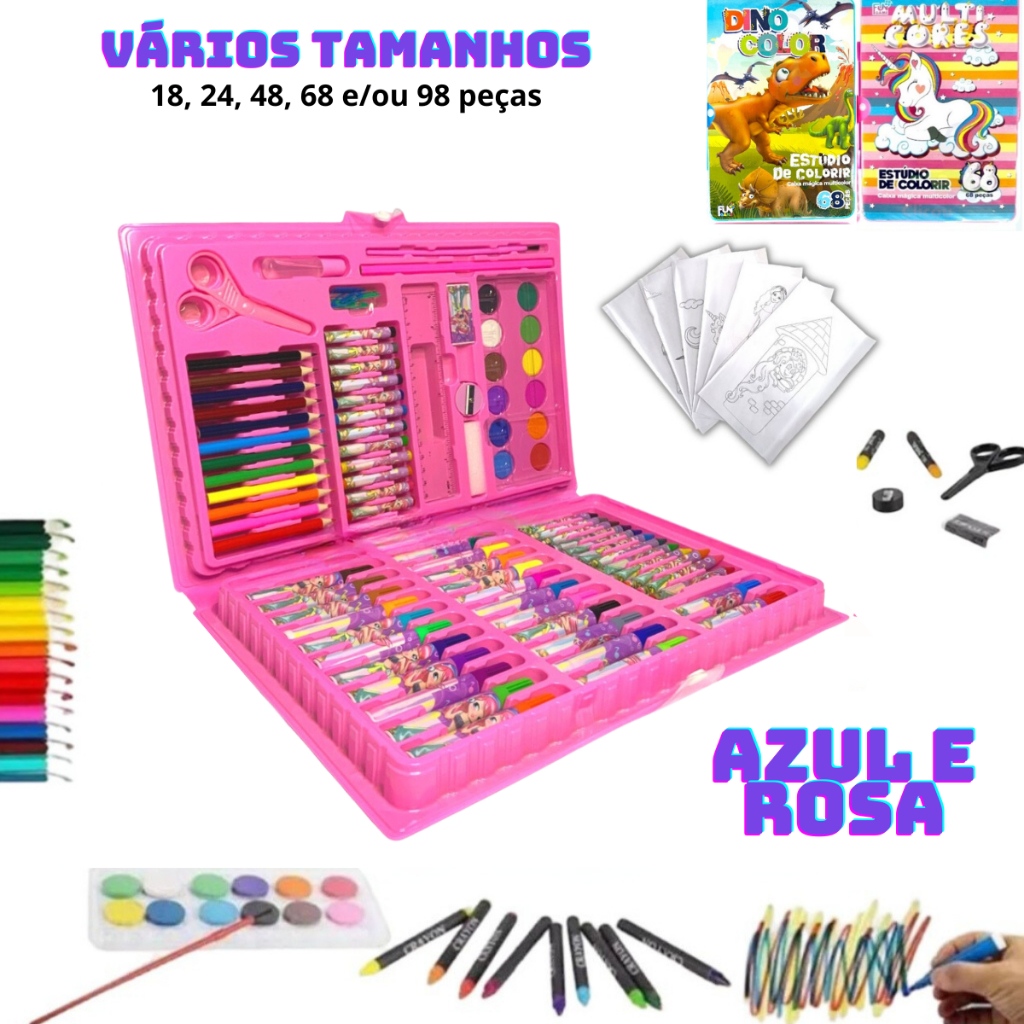 Estojo de Pintura Infantil com Canetinhas, Lapis de Cor e Aquarela Para Colorir - Maleta de Pintura