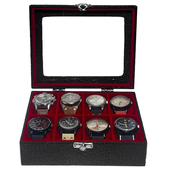 Caixa Maleta Estojo Para 8 Relógios Com Vidro Preto Com Interno Aveludado Vermelho