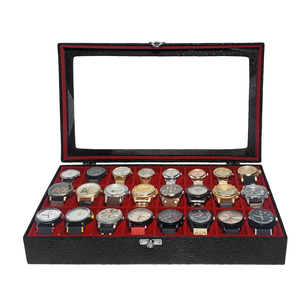 Estojo Para Organizar 24 Relógios Preto Com Interno Aveludado Vermelho