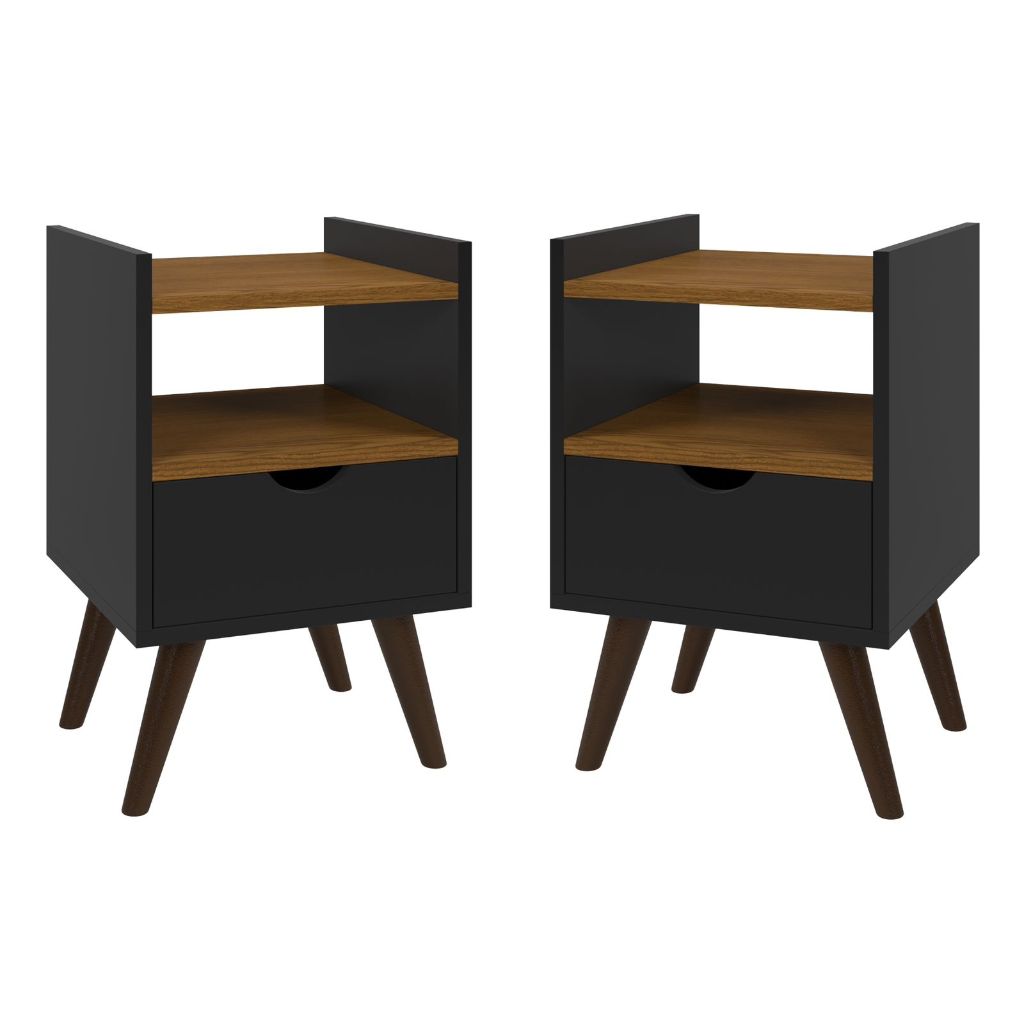 Kit Com 2 Mesas De Cabeceira Quarto Retrô Pés Palito Com Nicho e 1 Gaveta - Alice - Preto Com Freijó - Lojas GD Móveis