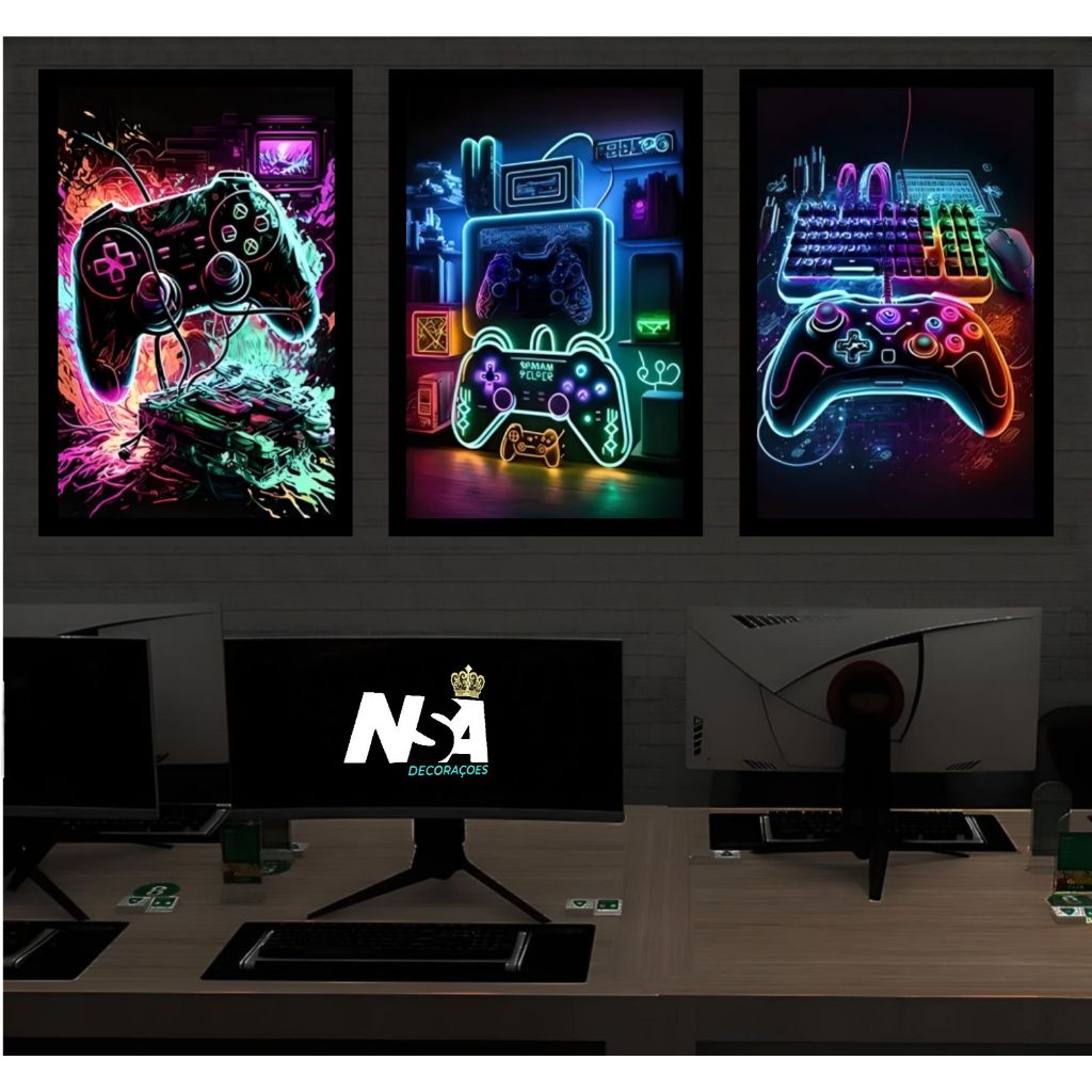 Kit Quadros Decorativos Mosaico 3 Peças Trio Frase Hora do Jogo Video Game Controles Console Gamer Abstrato