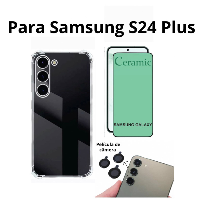 Kit 3X1 Samsung Galaxy S24 Plus - Película Frontal Cerâmica 9D + Capa Transparente Anti-Impacto TPU + Pelicula de Câmera Traseira l Top