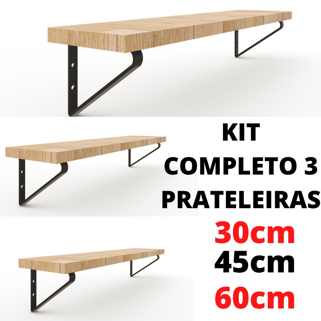 Kit 3 Prateleiras Industrial Madeira + Mão Francesa Quarto/Sala/ Cozinha