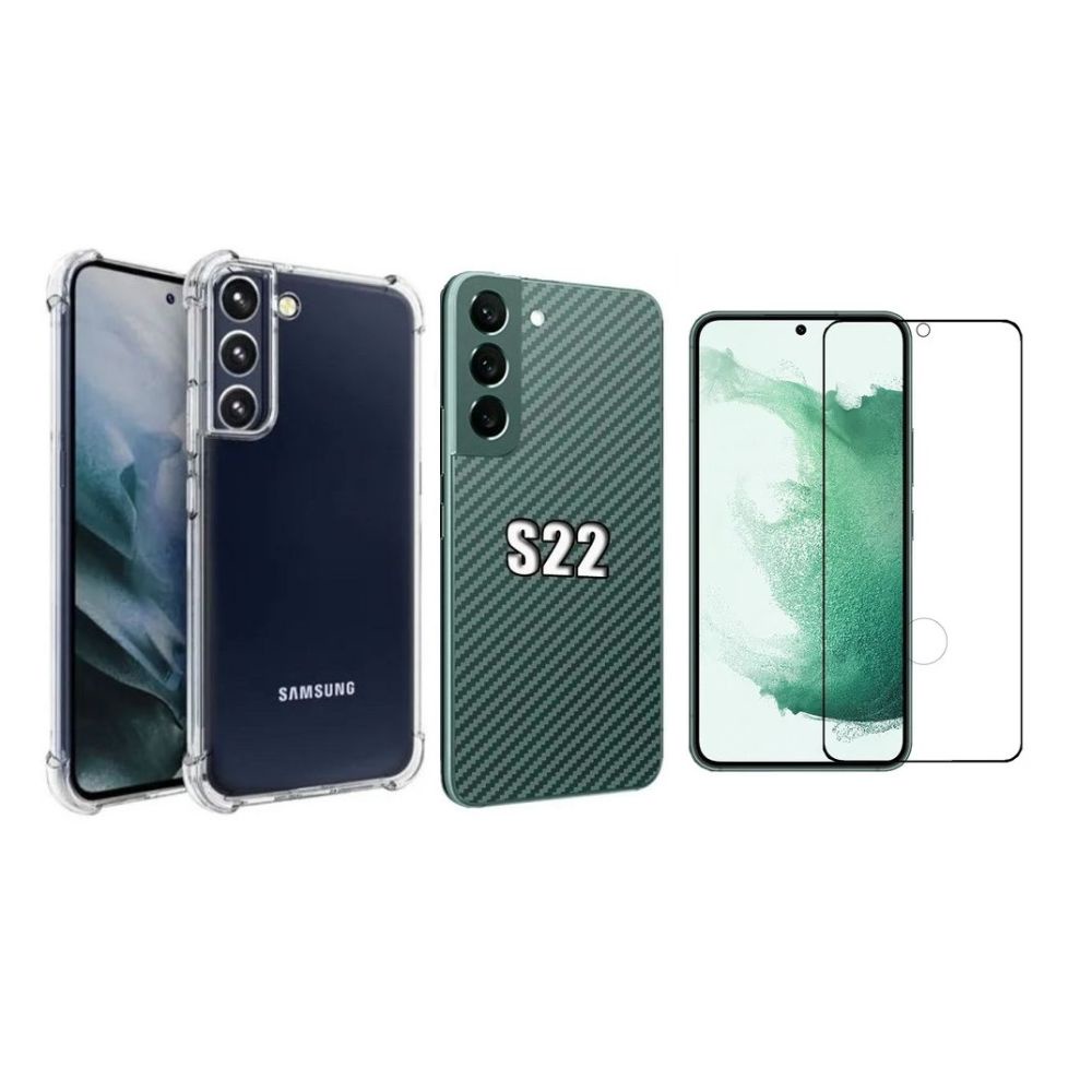 Capa Anti Impacto Transparente + Pelicula de Vidro 3D + Skin Verso Fibra de Carbono para Samsung Galaxy S22