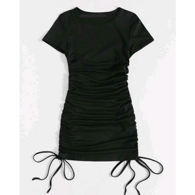 Kit 2 Vestido Canelado Com Manguinha Midi Gola Redonda Franzido Drapeado Com Amarras na Lateral