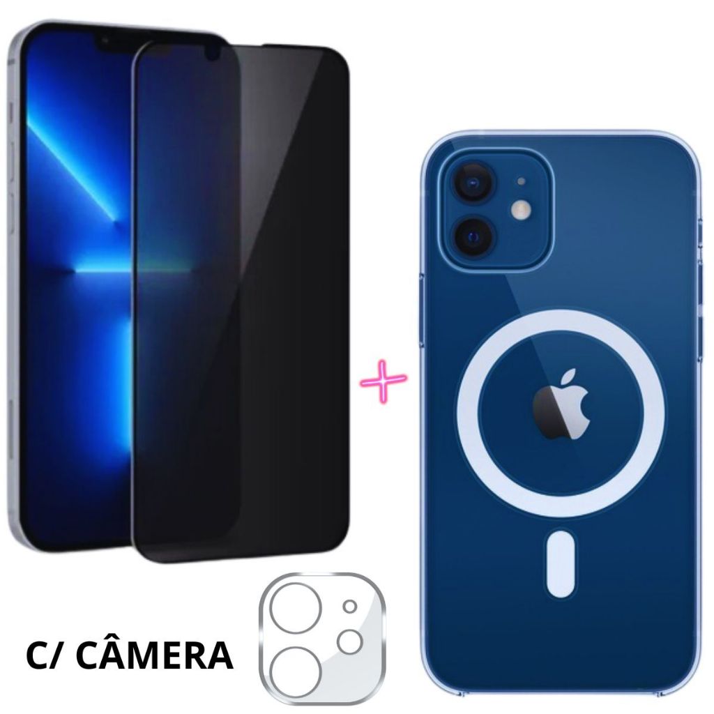Kit Capa MagSafe Transparente + Película 3D Privacidade P/ iPhone 12