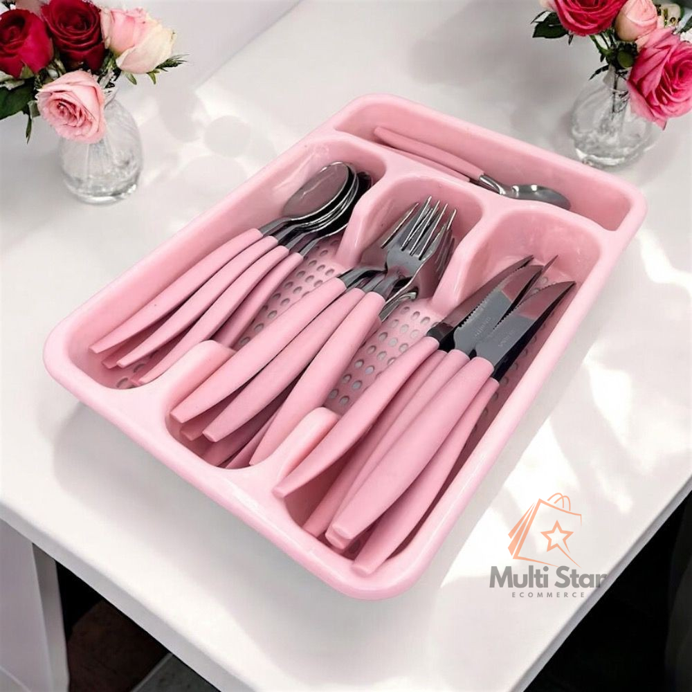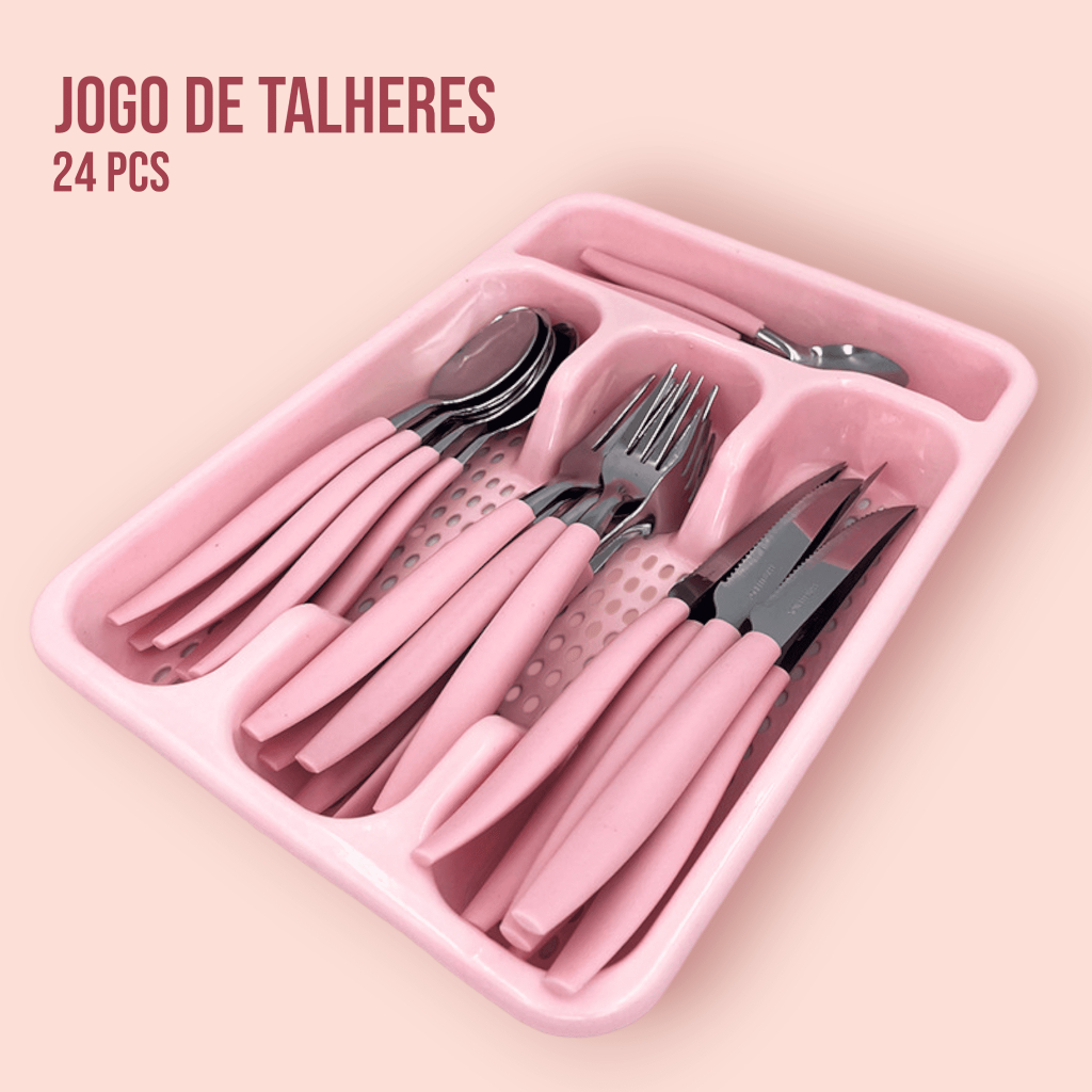 Jogo De Talheres cor Rosa Faqueiro Aço Inox Com Gaveteiro suporte colher garfo faca
