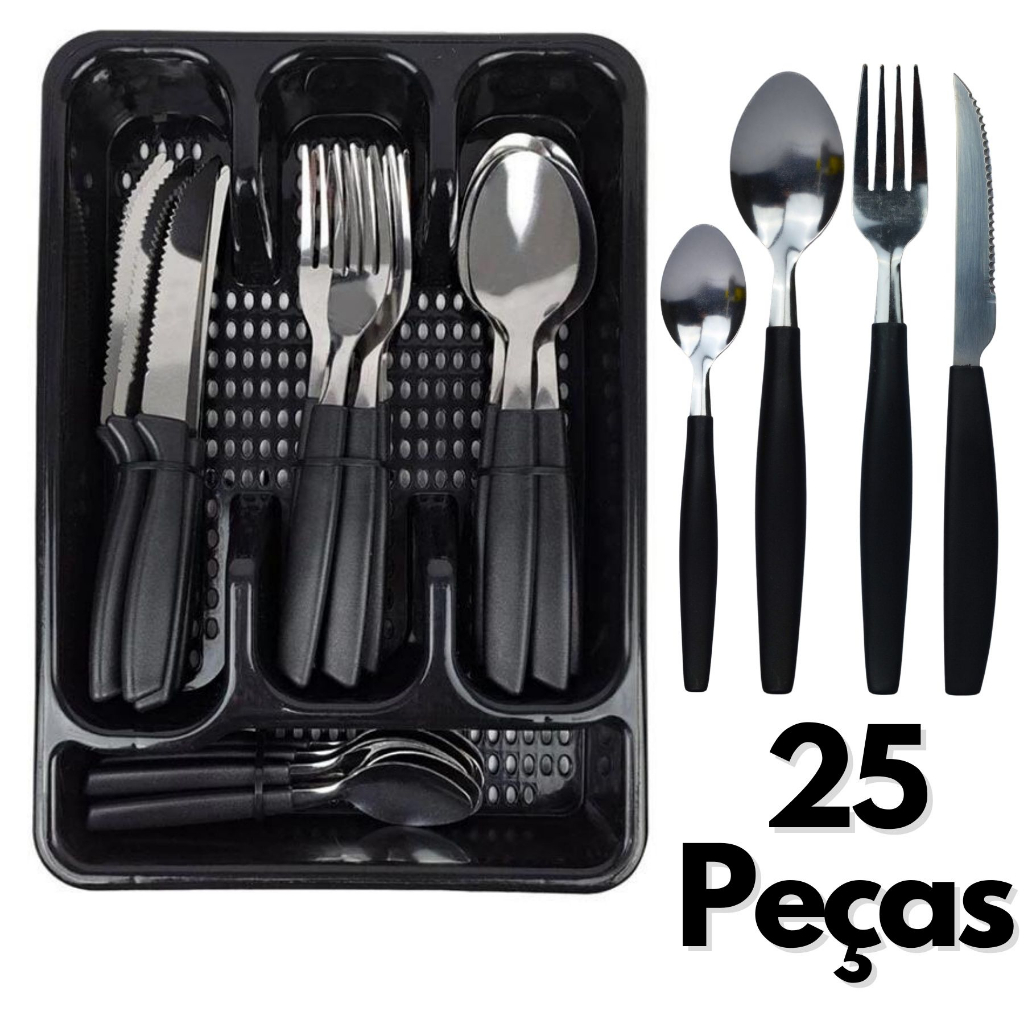 Jogo de Talheres 25 Peças Completo Conjunto Faqueiro Aço Inox + Organizador presente Domestico Cozinha Preto