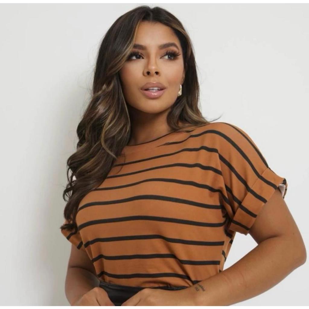 Blusa Básica Feminina Listrada T Shirt Manga Gola Redonda Marta Super Tendência 2023.