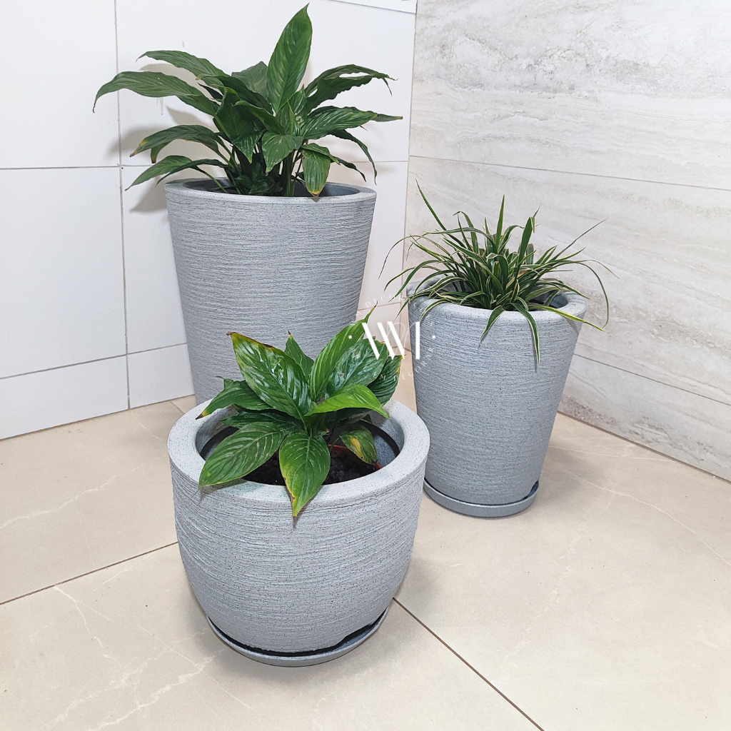 Kit Com 3 Vasos Decorativo de Planta Escovado Polietileno Com Prato Cone + Bojo + Bacia