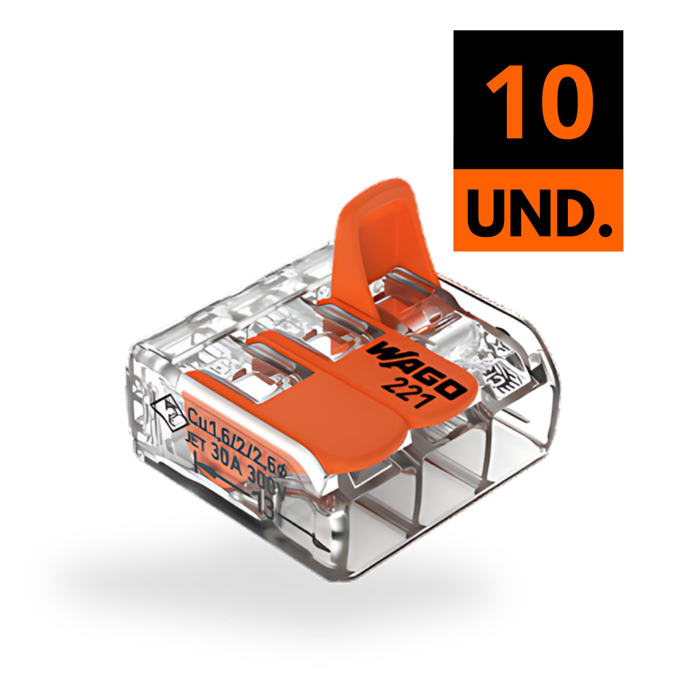 Kit 10 Conectores De Emenda Para Fios Elétrico 3 Polos Flexível 0,14 – 4,0 mm² 32A Wago Isola Compacto 221-413