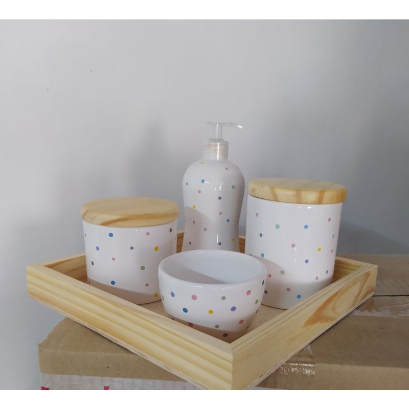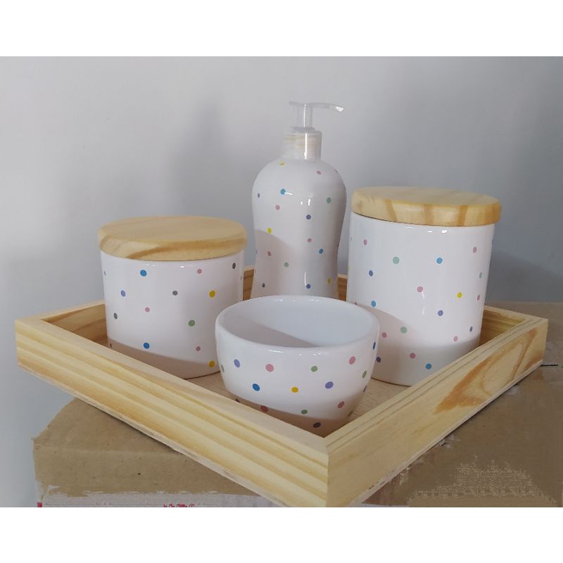 Kit Higiene Bebe Porcelana 4 Peças c Porta Pentes Poa Colorido Tampa Pinus