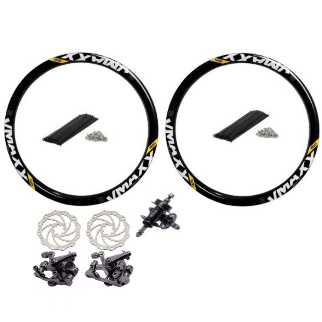 Par 2 Aro Vzan Vmaxx Preto Aro 26 Parede Dupla Reforçado Dh Paredão Para Freio A Disco + Raios Finos Pretos + Cubos Aço 36F Esferado Com Eixo Porca Par Roda + Freio a Disco MTB com pinças e disco dianteiro e traseiro Com Pastilhas