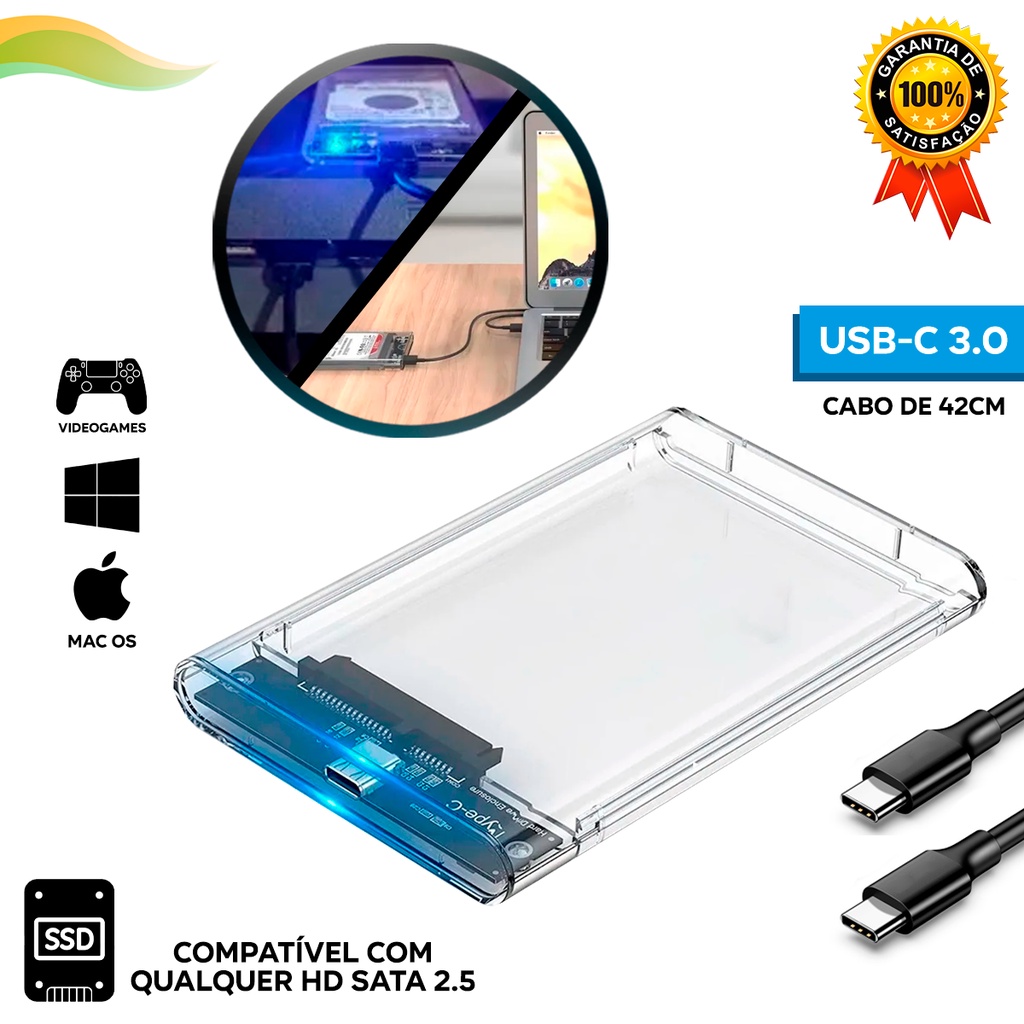 Case Externo SSD/HD 2.5" USB-C 3.1 Compatível com PC, Notebook, PS4 e Xbox Cabo USB C Turbo