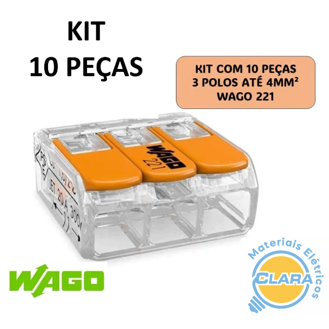 Kit 10pçs Emendas WAGO Conector 3 Polos 0,08 a 4,0mm² Até 32A 221-413 - 10 unidades. Envio Rapido.