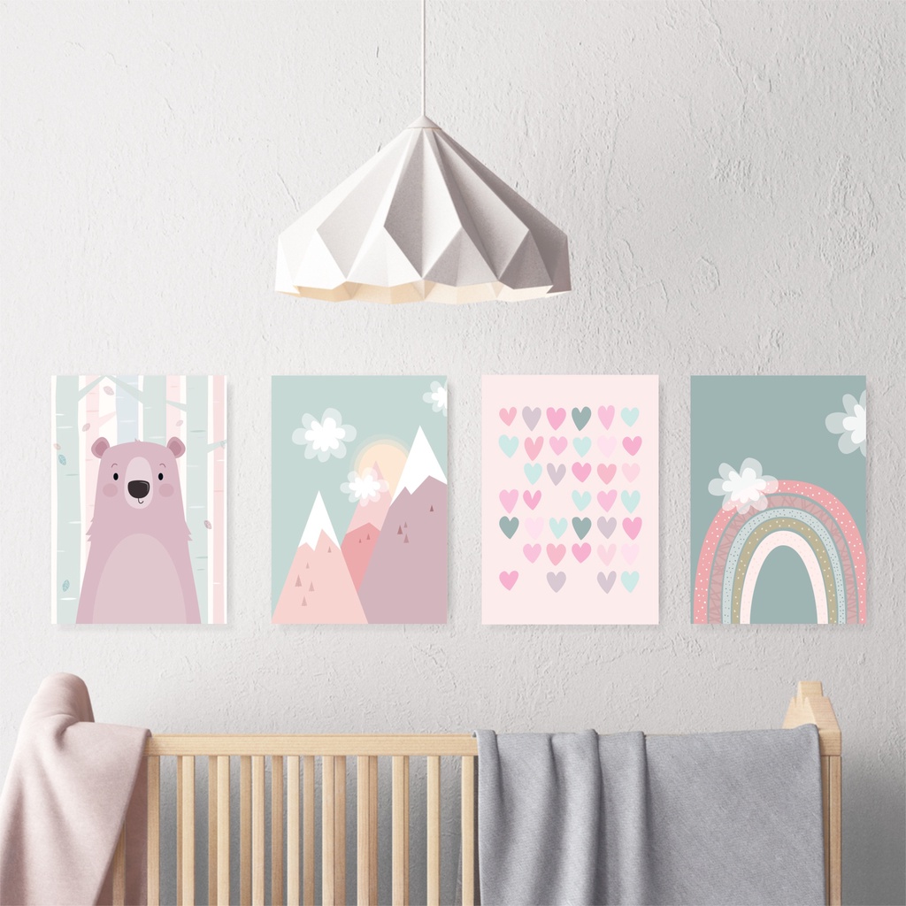 Kit com 4 Quadros / Pôster Infantil - Decoração Menina - Tons Pastéis - Candy Color - Urso, Arco Íris, Montanha, Coração - Decoração Afetiva Fofa - Kit 163