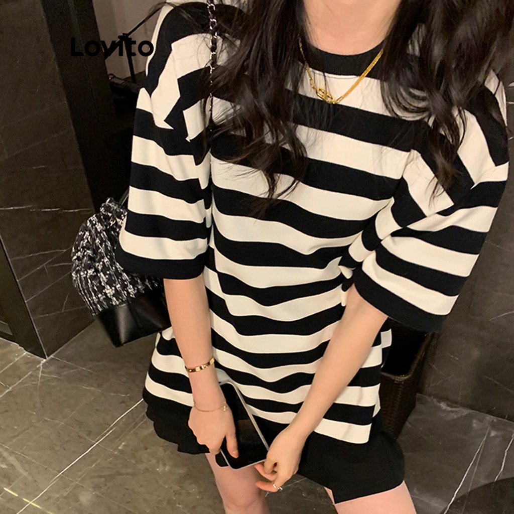 Lovito Camiseta Feminina Casual Listrada Para Todos Os Jogos LNA14208 (Preto E Branco)