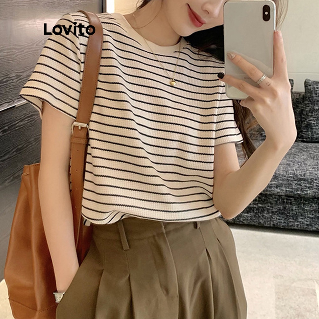 Lovito Camiseta Básica Listrada Casual Para Mulheres LBA05002 (Branco)