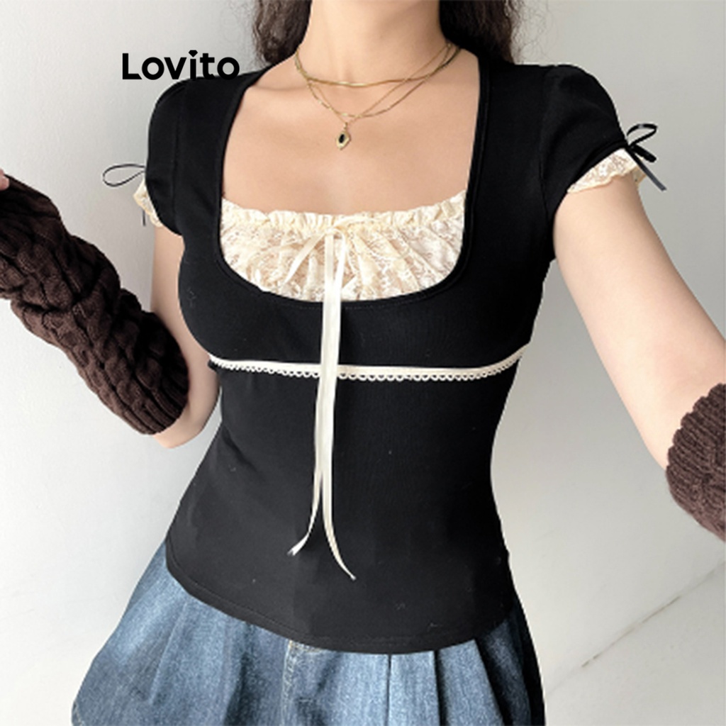 Lovito Camiseta Casual Patchwork Renda Falsa 2 Em 1 Para Mulheres LNE36067 (Preto E Branco)