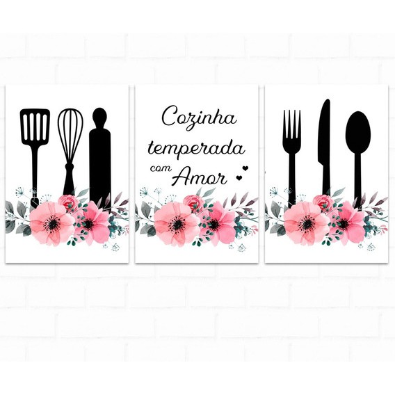kit placa Quadros Decorativos 3 peças Cozinha Utensílios Frases flores