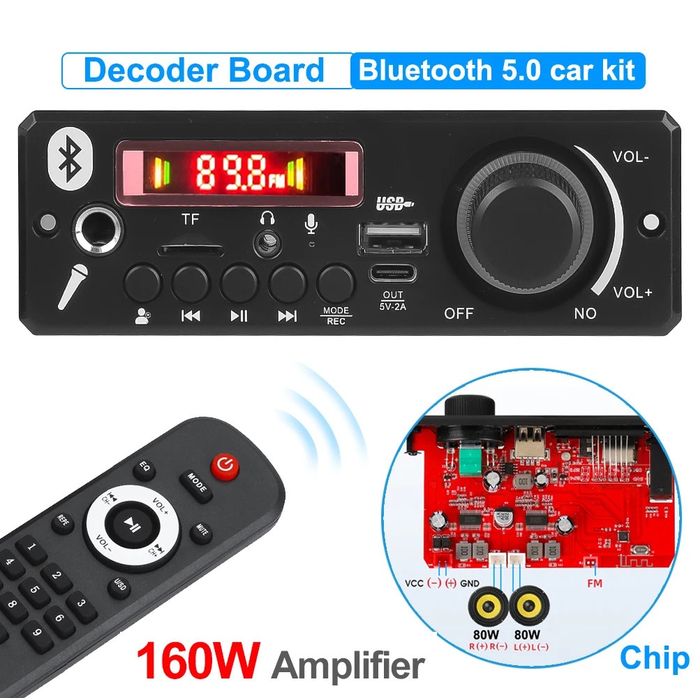 Placa Decodificadora MP3 Bluetooth 5.0 2 * 80W Amplificador De 160W Reprodutor De Áudio 12V DIY MP3 Player Car FM Módulo De Rádio TF USB Mic Record Call