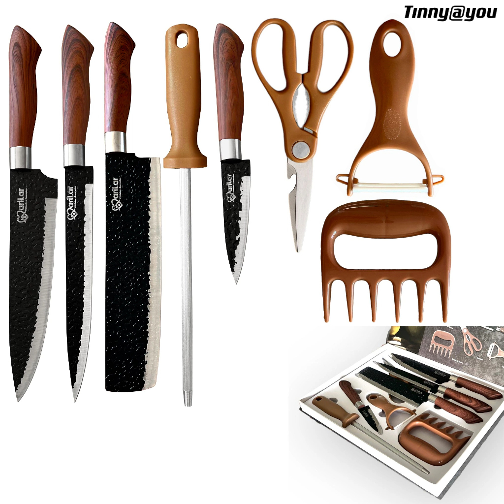 Kit de Facas para Churrasco e Cozinha: 8 Peças em Aço Inoxidável com Garra e Amolador Enviado Cor Aleatória Preto Ou Marrom Tinny You