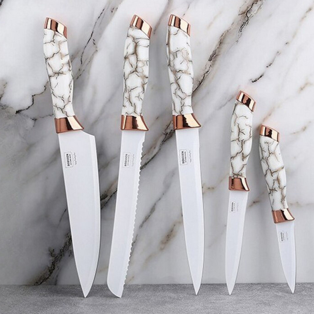 Kit Jogo De Facas Marmorizadas 6 Peças Conjunto Aço Inox Profissional Moderno Chef Cozinha Cabo Ergonômico Branco Churrasco