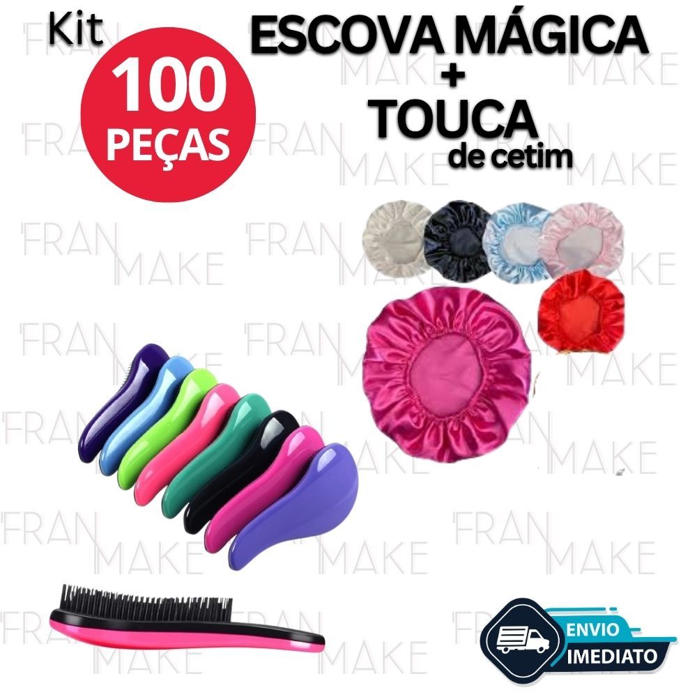 Atacado Kit 100 Unidades com 50 Escova Mágica Anti Frizz e 50 Toucas de Cetim para Day After Escolha a cor