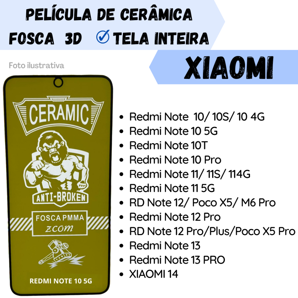 Película Fosca de Cerâmica Flexível Para XIAOMI Redmi Note 10-10S-10 4G / Note 10 5G / Note 10T / Note 10 Pro / Note 11-11S-114G / Note 11 5G / Note 12/ Redmi Note 12 Pro / Note 12 Pro Plus / Note 13 / Note 13 Pro / Xiaomi 14 /Protetor de Tela 3D.