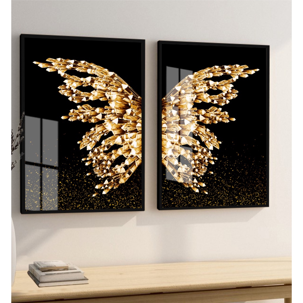 Kit 2 Quadros decorativos asas douradas borboleta gold para quarto sala corredor casa hall com moldura e vidro