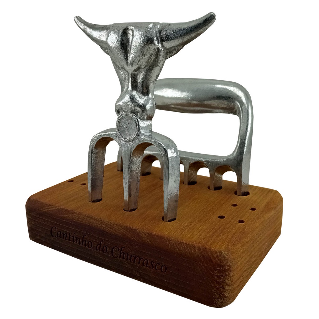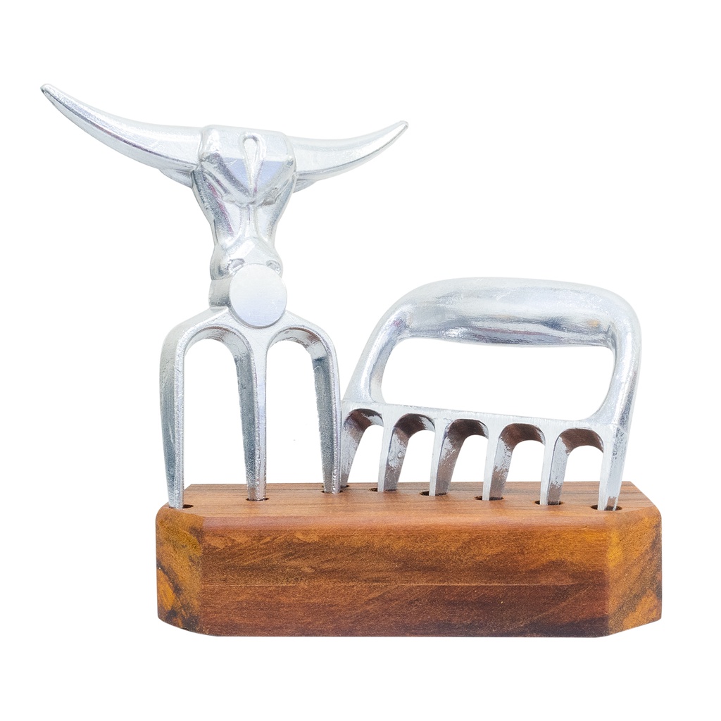 Kit Churrasco Garfo Garra De Urso + Tridente Cabeça Boi Com Suporte em Madeira de Demolição Tratada